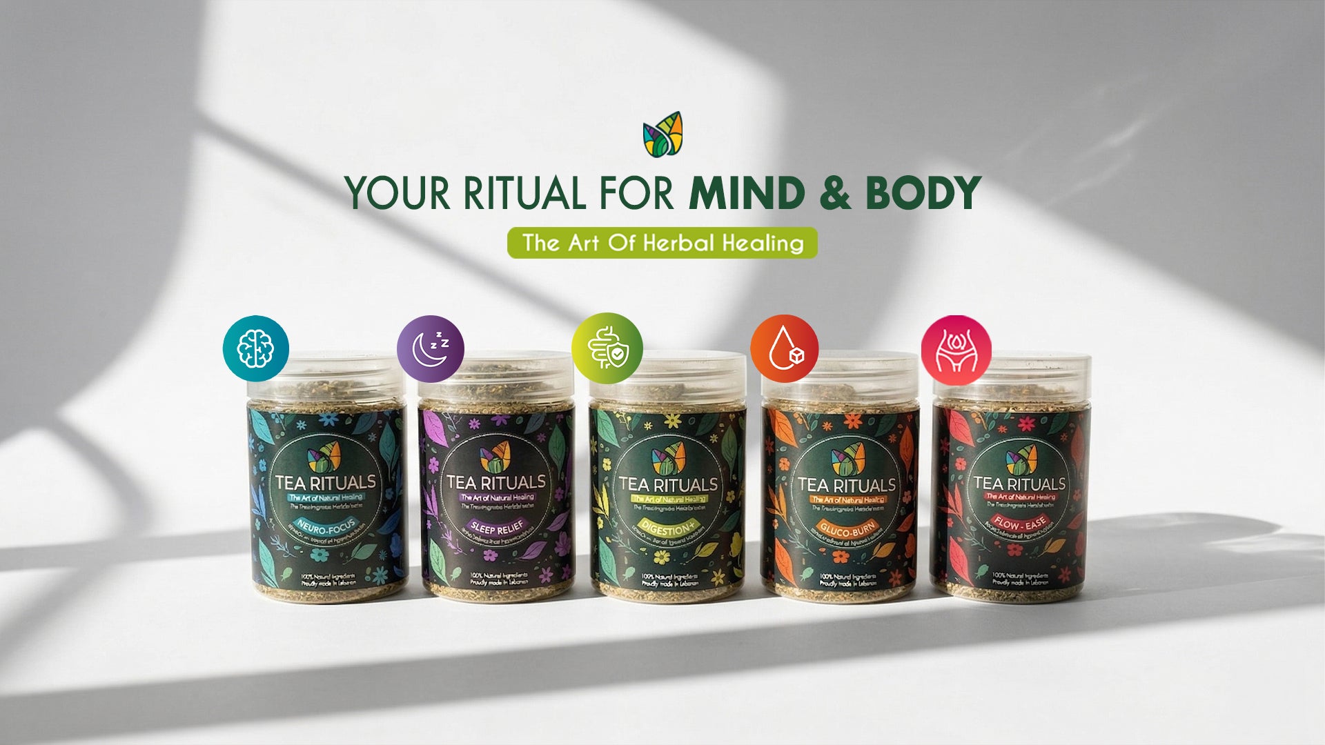 Tea Rituals blends ancient functional herbs with modern intention. Every ingredient serves a purpose. Every sip moves you closer to how you want to feel.